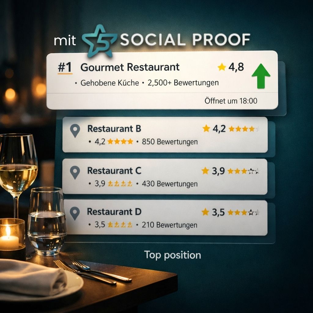 SOCIAL PROOF wurde speziell für Restaurants, Cafés und Bars entwickelt, bei denen Google-Bewertungen eine entscheidende Rolle bei der Neukundengewinnung spielen. Besonders profitieren Betriebe, die weniger als 1.000 Google-Bewertungen und weniger als 4,8 Sterne im Durchschnitt haben.